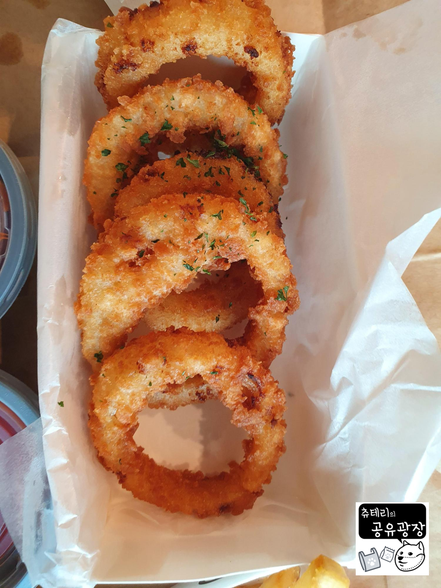 사이드메뉴로 코올슬로우, 감자튀김, 어니언링을 주문했다. 개인적으로 사이드메뉴가 매우 마음에 들었다. 코올슬로우는 적당히 달달시큼해서 느낌함을 잘 잡아줬다. 캐첩도 플라스틱 용기에 깔끔하게 담겨져 나와서 찍어먹기에 편리했다.