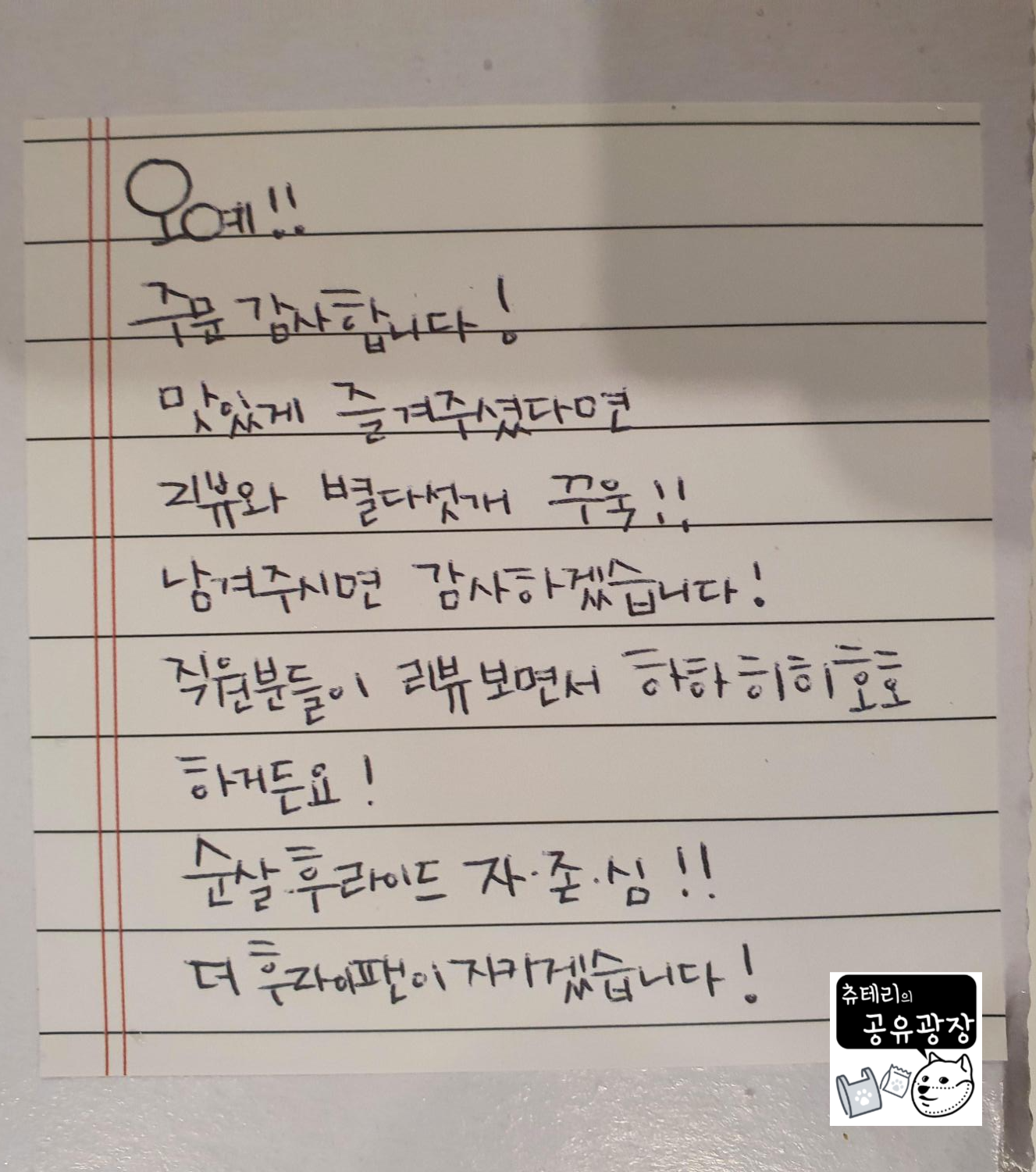 배달 도착 직후의 모습이다. 치킨 상자에 메모가 붙어있었다. 리뷰를 좋게 써달라는 메모가 적혀있다. 내용 자체는 마케팅(?)스러운 문구이긴 하지만 유쾌함이 느껴진다.