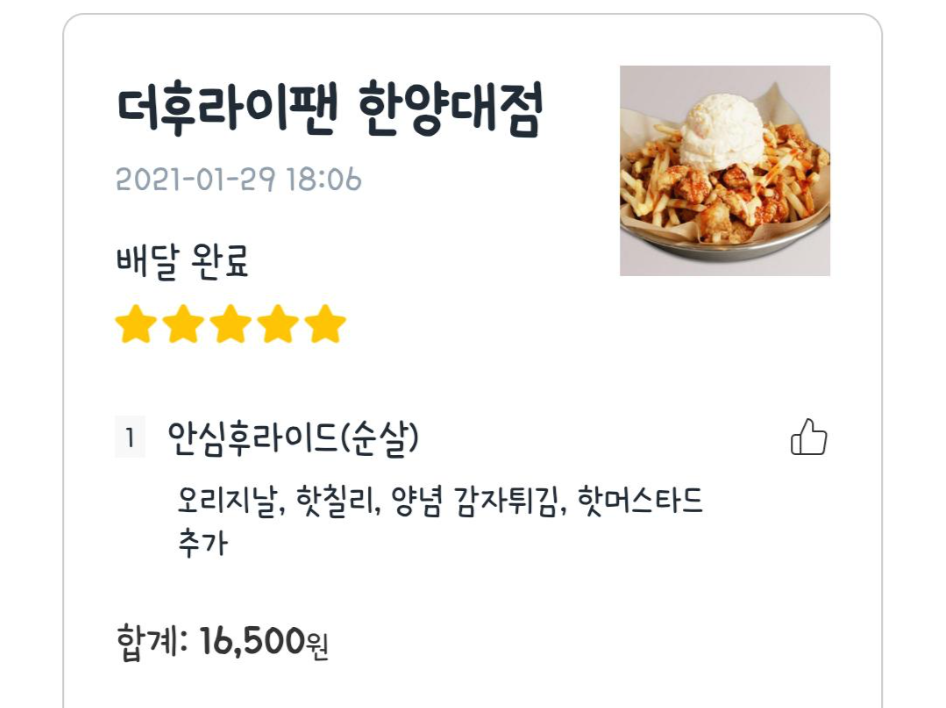딱히 먹고 싶은게 떠오르지 않을 때는 무조건 치킨이다. 예전에 짝궁과 자주 먹었던 '더후라이팬'이 떠올랐다. 한양대점에서 먹었던 것은 아니지만 추억을 되세기며 안심후라이드(순살)를 주문했다. 2가지 디핑소스는 기본적으로 선택할 수 있고 500원을 더 내면 디핑소스를 1가지 더 (총 3가지) 먹어볼 수 있다.