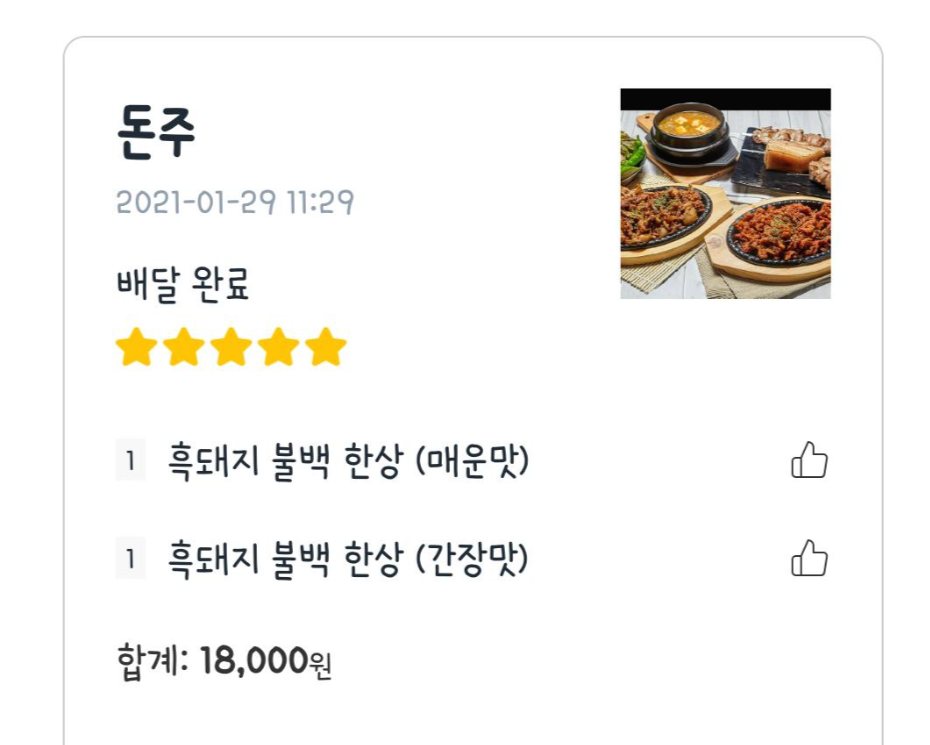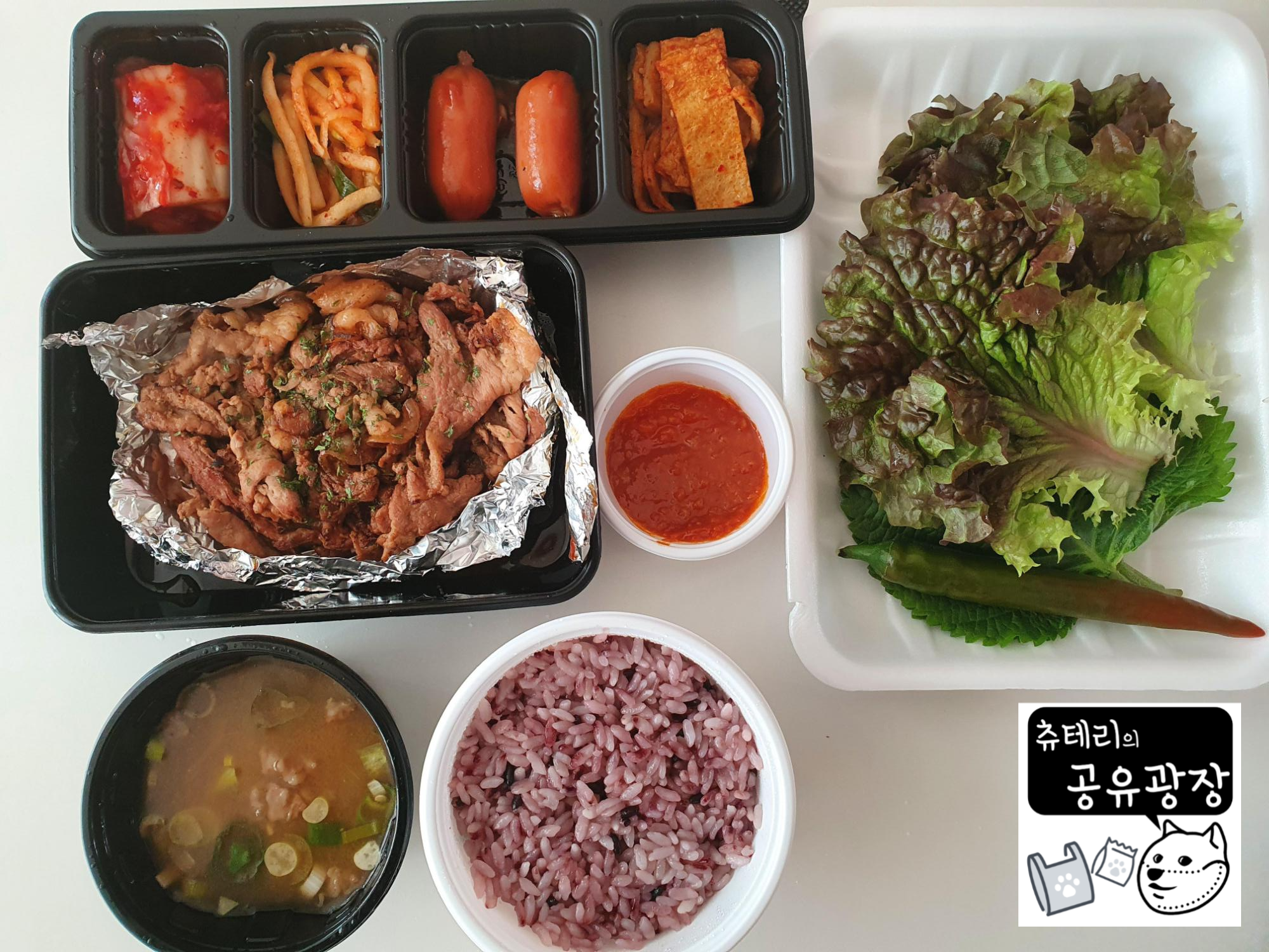 간장맛 불백과 매운맛 불백의 구성은 완전히 똑같다. 사진 상 하나만 보이는 것은 아래에 겹쳐져 있어서 그런 것이지 한개만 배달된 것은 없다. 김치, 무생채, 비엔나, 어묵볶음, 된장, 밥, 쌈야채, 된장국 그리고 불백으로 구성돼 있다.