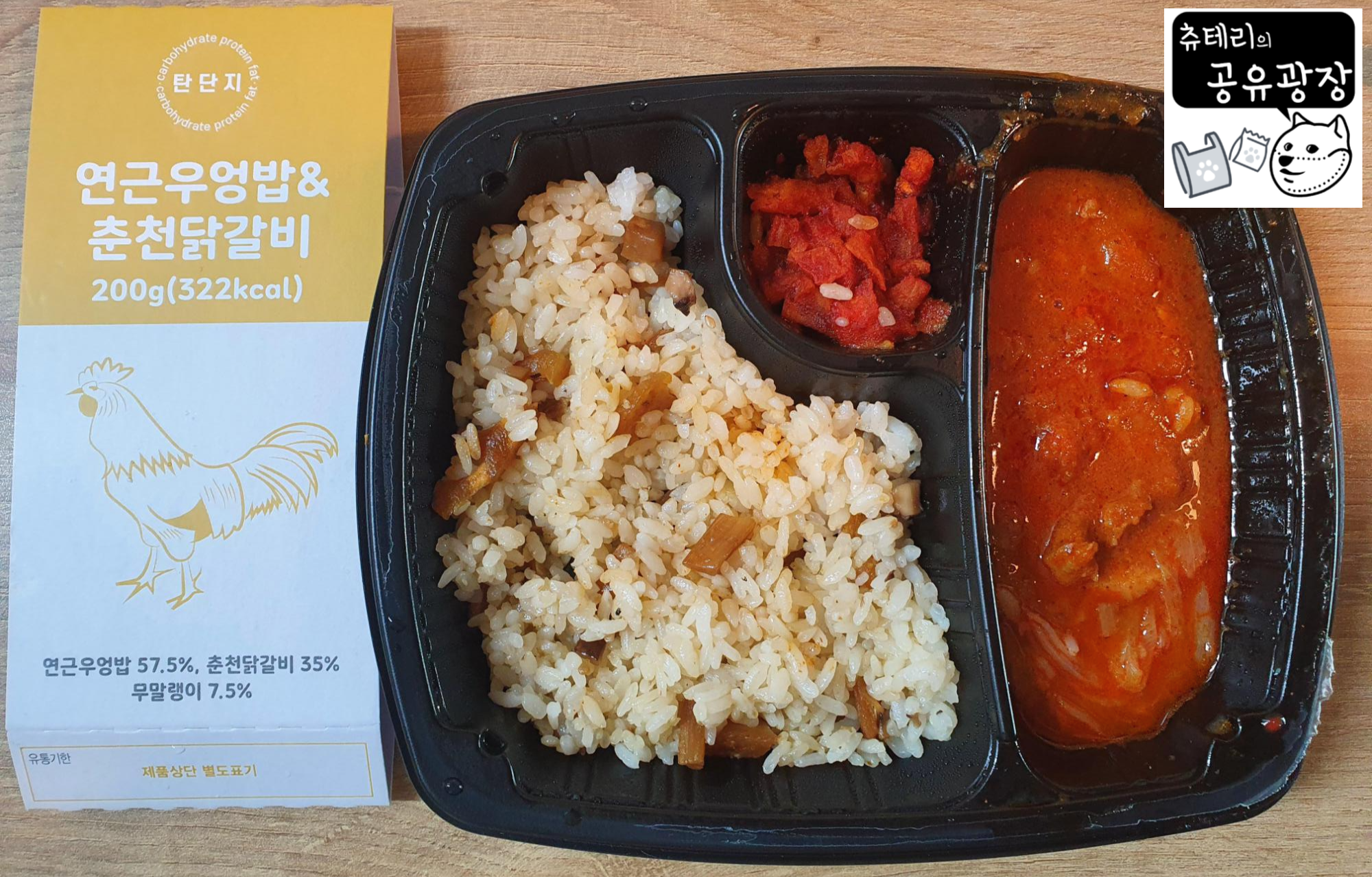 먹기전에 찍은 연근우엉밥&춘천닭갈비 사진이다. 반찬은 무장아찌와 닭갈비다. 의외로 무장아찌가 맛있다. 닭갈비도 꽤나 자극적인 맛이고 매콤하다. 물론 맛집에서 먹는 닭갈비 맛은 아니다. 이건 다이어트식이다. 다이어트식을 감안하고 먹으면 생각보다 꽤나 맛있다.