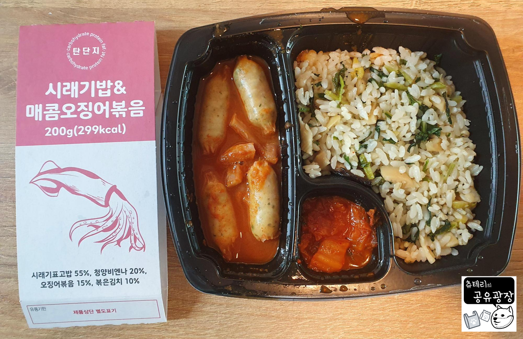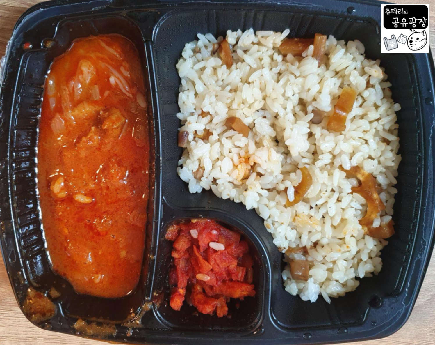 이건 시래기밥&매콤오징어볶음이다. 밥은 연근우엉밥보다는 시래기밥쪽이 더 맛있다. 반찬은 오징어볶음 약간, 청양비엔나. 볶은김치다. 오징어볶음은 정말 한 2~3조각들어있다. 소세지처럼 생긴게 청양비엔나인데 아마 닭가슴살로 만든 것 같다. 반찬의 맛은 그냥 무난무난하다. 다만 볶은김치는 정말 맛있다. 달고 자극적이다. 물론 양은 적다.