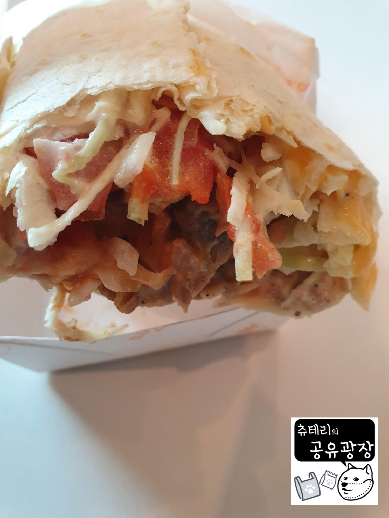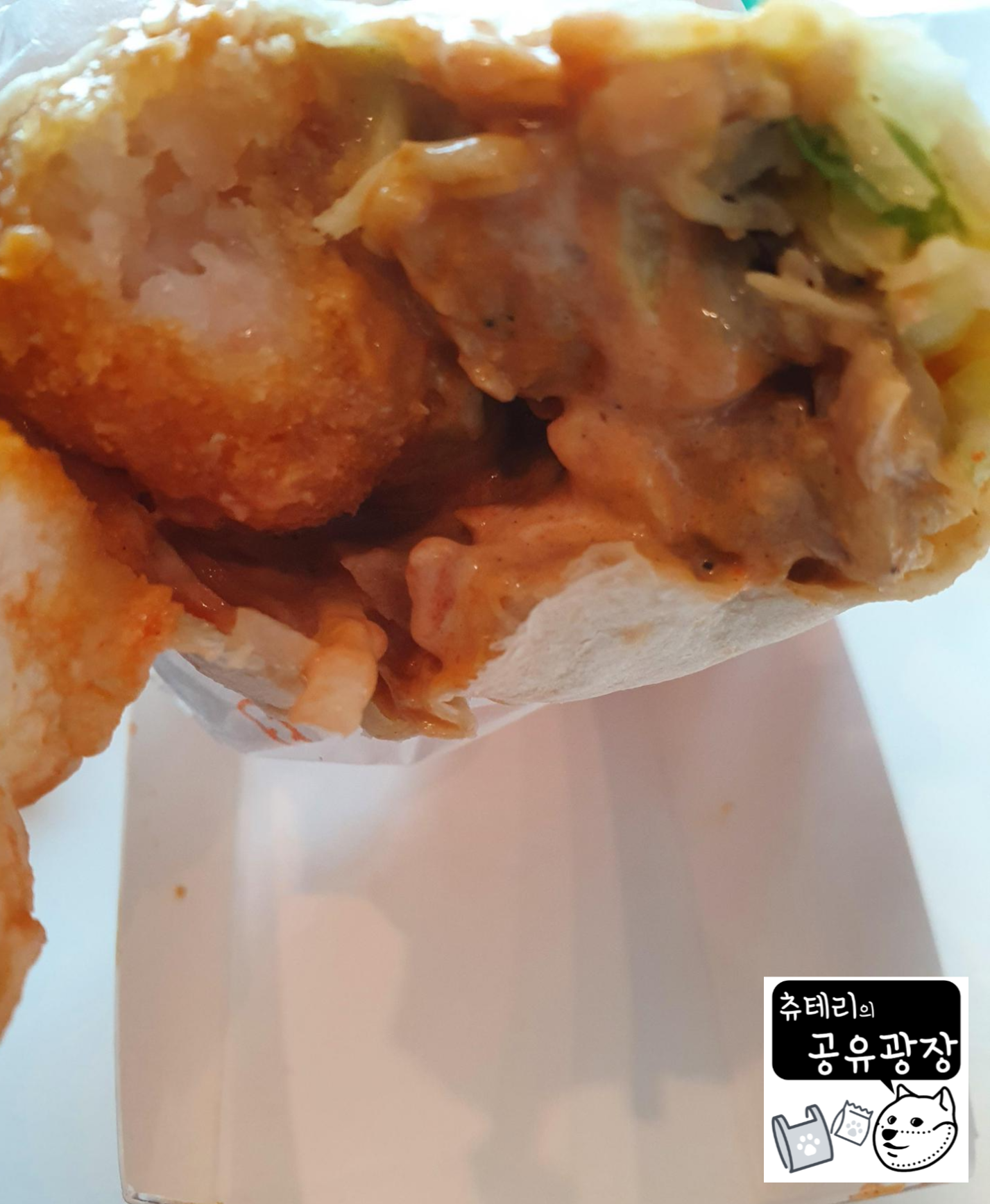 개인적으로 매운 것을 잘 못먹어서 그런지 1단계 매운맛이었는데도 살짝 알딸딸하게 매운 맛이 느껴졌다. 새우치킨케밥과 치즈치킨케밥의 속을 채운 양념은 비슷하고 새우가 들어갔냐 치즈가 들어갔냐정도의 차이가 났다. 한 입 배어물면 입안이 꽉차는 느낌이다. 케밥 특유의 이국적인 향신료 맛이 살짝 난다. 토마토, 양배추, 각종양념이 채워져있다.