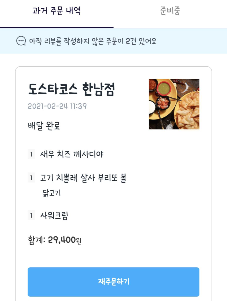 백종원의 스트리트 푸드파이터 멕시코편을 보다가 갑자기 '도스타코스'가 떠올랐다. 생각난김에 다음날 점심에 바로 쿠팡잇츠에서 주문해봤다. 메뉴는 새우 치즈 께사디야(퀘사디아)와 치뽈레 살사 부리또볼이다.