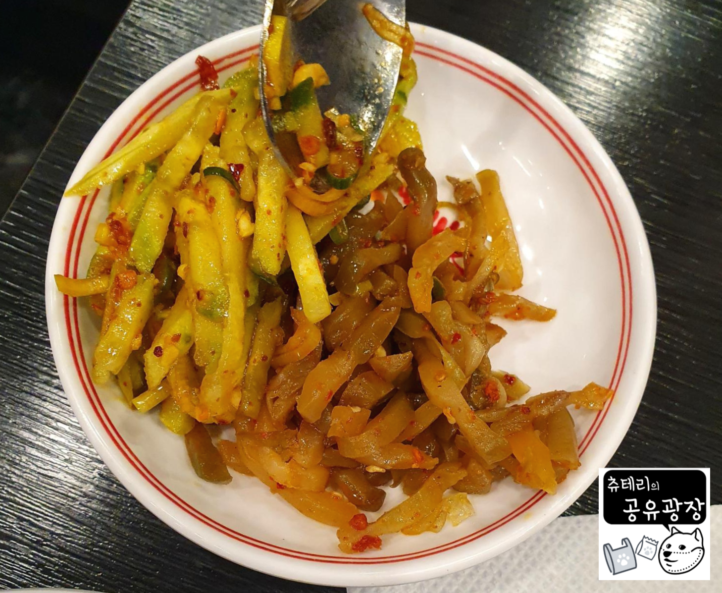 주문한 매뉴가 나왔다. 비교적 빨리나온다. 비빔면 위에는 원래 오이가 잔뜩 올려져 있는데 오이를 먹지 못해서 모두 덜어냈다. (호박인줄 알았는데 오이였다. ㅠㅠ) 그럼에도 불구하고 비빔면에 오이맛이 아주 듬뿍났다. 처음 조리할때부터 오이가 들어간 매뉴였나보다. 원래는 내가 비빔면을 먹으려고했지만 오이때문에 본의아니게 짝궁과 매뉴를 바꾸게됐다.(미안하오..ㅠㅠ) 그래도 비빔면 맛 설명은 해야하니 살짝 먹어봤다. 고추기름맛이 강하게 올라왔고 달콤짬짜름한 맛이였다. 면은 옥수수면인데 굉장히 쫄깃쫄깃해서 이빨로도 잘 끊어지지 않았다. 개인적으로 오이맛만 없다면 별미로 생각될 맛이였다.